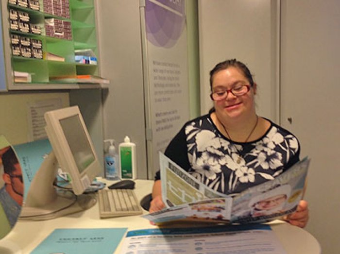 Элеонор начала работать в компании Specsavers, занимающейся очками и линзами, год назад и работает 2 раза в неделю в первой половине дня. Персонал очень помогает ей. У нее разные обязанности, в том числе сканирование и сортировка документов, чистка и подготовка очков к продаже.